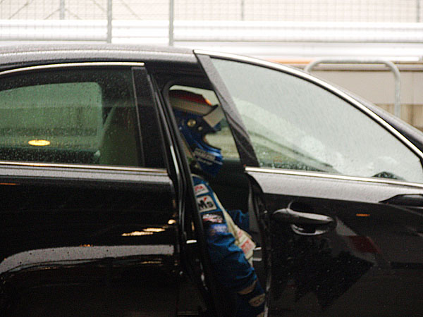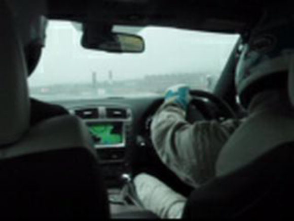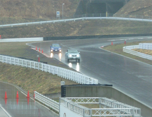 プロドライバーの同乗試乗です。このように4台連なって、大雨のなか四人乗車で走ります。