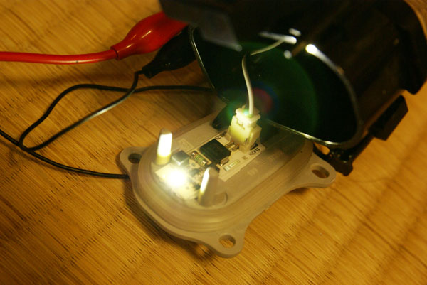 手持ちのLEDパワーライトで試験点灯。これぐらい明るくないと!