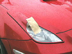 ヘッドライトの光軸を検査します。ハイビームのみ検査するので、ロービーム側はガムテープでふさいでおきます。